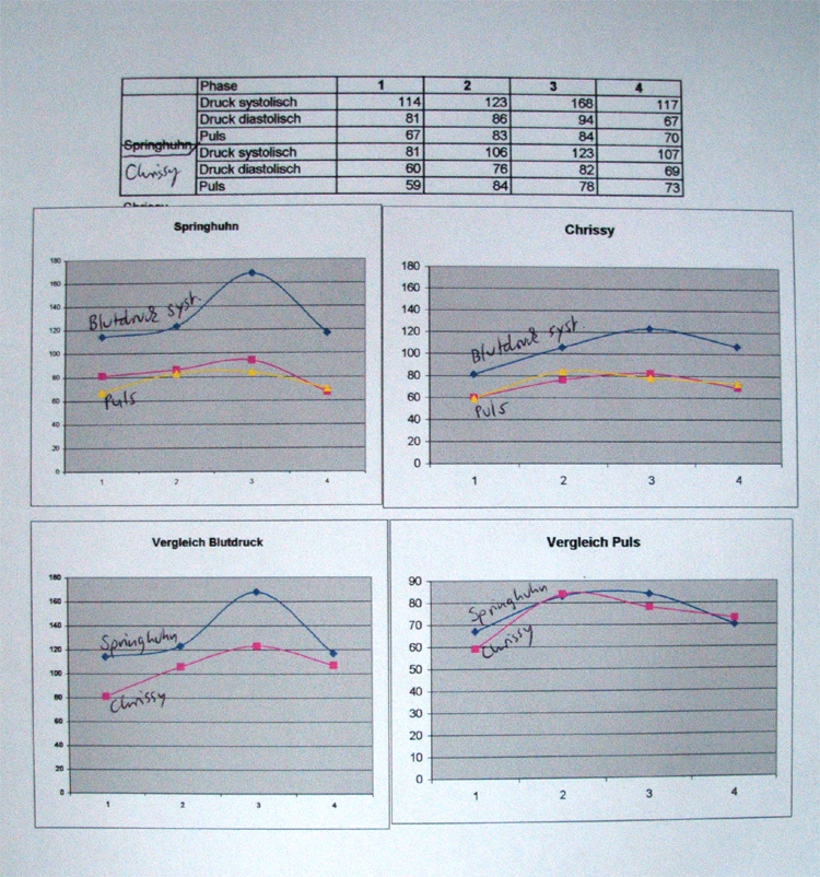Zur Erläuterung der Tabellen und Diagramme unten: Phase 1 : vor der Sendung Phase 2: während der Sendung Phase 3: Zusatzbelastung: Während des Meßvorgangs mußten wir einander in die Augen schauen! Phase 4: nach der Sendung Wie man sieht, ein kräftiger Anstieg vor allem bei Springhuhns Druck, aber auch bei Chrissy eine kräftige Wirkung. Insgesamt mehr auf den Druck als auf den Puls. Was man daraus noch weiterhin schließen kann, soll der Arbeit künftiger Generationen vorbehalten bleiben. |