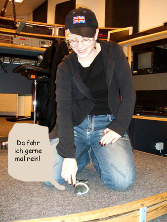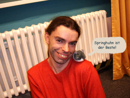 ..übereinstimmend wurde dann nur noch festgestellt, dass "die da oben" auch eine Randgruppe sind, und zwar die unbeliebteste.. ansonsten konnten wir mit einer neuartigen technischen Methode die Gedanken unserer Aufziehmaus sichtbar machen! Tschüß sagt jetzt Springhuhn.. (bis Ende März keine Live-Sendung mit mir) und viel Spaß in der Zwischenzeit mit Chrissy und Christian! | |