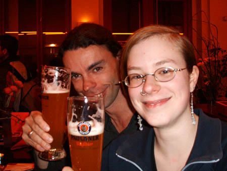 Foto links Mitte: Tatsächlich die Bedienung! Was für ein Schnappschuß - denn meist sahen wir sie nur eilig vorbeihuschen, so schwer faßbar wie ein Phantom.. Bild darunter: Man beachte die Rotverschiebung aller Lichtquellen, hervorgerufen durch unsere starke Gehirntätigkeit! | |