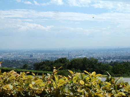 ..und damit ist schon der nächste Morgen erreicht.. immer noch bei schönem, warmem Wetter.. oben am Kahlenberg, gerade noch innerhalb der Wiener Stadtgrenze, laufen riesige Käfer umher und gehen ihren undurchschaubaren Geschäften nach. Wir setzten uns lieber auf die Aussichtsterrasse des Cafés Cobenzl und genossen den weiten Blick.. |