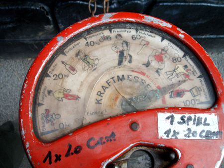 ..am Ende blieb uns sogar noch ein bißchen Zeit für einen weiteren Praterbummel; an den Kraftgeräten ermittelten wir, daß Christian und Springhuhn beide zum "Rausschmeißer" taugen (Christian mit noch 8 kg mehr Druckkraft drauf, wie ich zugeben muß), Beweis siehe Foto! Kurz darauf begann es dann zu regnen, so daß wir wahrscheinlich die letzten richtig schönen Sommertage erwischt hatten und uns der Abschied zwar schwer, aber nicht gar so schwer fiel.. aber wir kommen wieder!! |