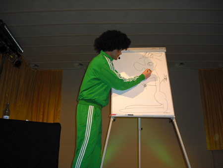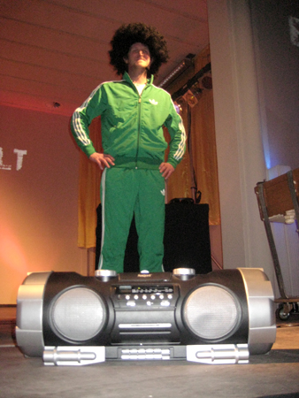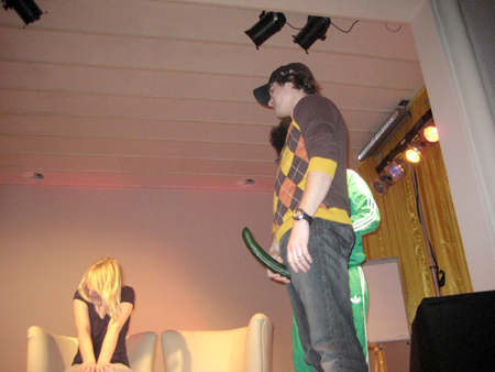 ..und aus der Perspektive wirkt Tommy Wosch noch größer. Und irgendwo ganz oben sitzt der Kopf drauf. Wie immer mußte Michi ihn auf dem fahrbaren Klo nach vorn karren, und dann besahen sich die Unterhaltungskünstler den rammelvollen Saal.. nachdem sie es geschafft hatten, die Stadt zu erreichen, obwohl es die Autobahnausfahrt "Frankfurt/Oder-Süd", die der Routenplaner auswarf, gar nicht gibt, und man nach Frankfurt/Oder-Mitte schon in Polen ist.. wir fielen übrigens nicht darauf rein! |