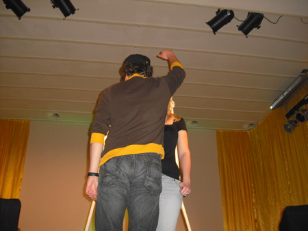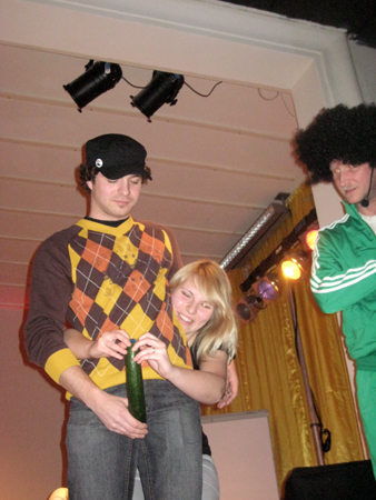 Zur Vorberitung des Achselgeruchs-Tests müssen sich die Testpersonen auf der Bühne mischen.. tatsächlich immer ein Lacherfolg. Und doch so wichtig für einen unbeeinflußten Test! Auch hier und heute konnte die Kandidatin ihren Liebsten erriechen. Ein weiterer Pluspunkt! |