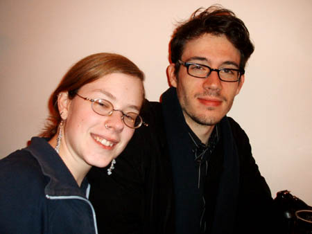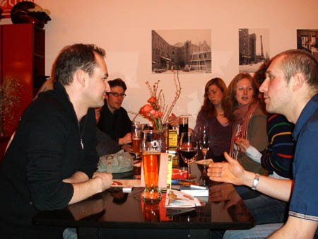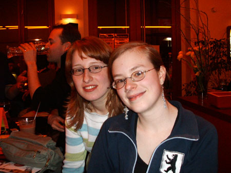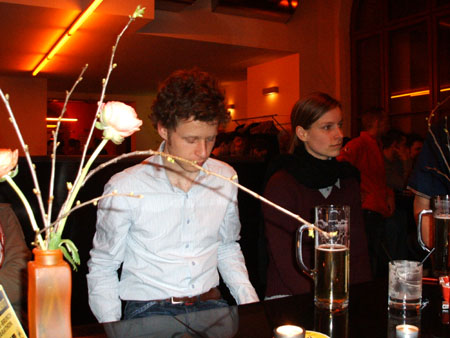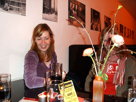 Foto links Mitte: Tatsächlich die Bedienung! Was für ein Schnappschuß - denn meist sahen wir sie nur eilig vorbeihuschen, so schwer faßbar wie ein Phantom.. Bild darunter: Man beachte die Rotverschiebung aller Lichtquellen, hervorgerufen durch unsere starke Gehirntätigkeit! | |