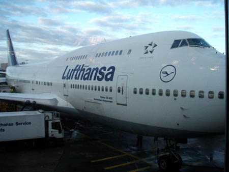 Alles fing mit diesem Jumbo-Jet an.. nein, gar nicht wahr. Erst einmal mußten Springhuhn und Pusteblume um 3 Uhr morgens aufstehen, um eines der ersten Flugzeuge vom Dorfflugplatz Tegel zum Verkehrsknotenpunkt Frankfurt (Main) zu erwischen. Dabei verpaßten sie den Bus, wären mit ihren schweren Rucksäcken beim Überqueren einer vereisten Straße (denn im Januar herrscht in Berlin tiefster Winter! So ist das!) beinahe aufs Maul gefallen und kamen dann doch noch pünktlich an.. und dann begann sie wirklich, die eigentliche Reise. Zum 1. Mal im Leben in die Vereinigten Staaten von Amerika! | |