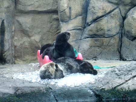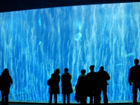 Dann ging es zur Hauptattraktion des Ortes.. weswegen jedenfalls wir eigentlich nach Monterey gekommen waren: Das Monterey Bay Aquarium! Eine schöne Anlage in einer der ehemaligen Sardinenbüchsenfabriken auf dere berühmten Cannery Row, mit vielen großen Aquarien, in denen vom kleinesten Seepferdchen bis hin zu riesigen Haien und Rochen alles gehalten wird, was in den hiesigen Gewässern so herumschwimmt.. und natürlich unsere speziellen Freunde, die putzigen Seeotter! Wir standen bestimmt eine Stunde vor ihrem Gehege und schauten zu, wie sie sich in einer Wanne voll mit Eisstückchen wälzten.. was halt so Otter-Vergnügungen sind.. | |