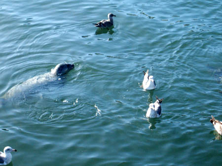 Oben eines der beachtlich großen Wasserbecken.. aber auch in der freien Natur gibt es in der Monterey Bay viele Meereslebewesen zu bestaunen! Die Seehunde treiben sich ständig im Hafenbecken herum und erfüllen die Gegend mit ihrem Gebell.. und wir hatten sogar das Glück, Otter in freier Wildbahn zu sehen, wie sie gemächlich in Rückenlage durch die Algenwälder schwimmen! Das Wetter war frühlingshaft mild.. Sonnenschein und 17 Grad (Plus!), das wünscht man sich doch, wenn man aus dem deutschen Winter kommt! |