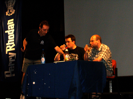 Noch ein Klassiker: H. G. Ewers, ältester lebender Rhodan-Autor, Mars-Experte und Erfinder unzähliger Nebenfiguren, ohne die die Serie entschieden ärmer gewesen wäre! Er las u.a. eine Passage aus seinem Planetenroman "DIE PARA-BASIS", den ich mir dann gleich noch antiquarisch besorgte und sogar signieren ließ.. Fan bleibt Fan! | ||||||||||||||||||||||||||||||||||||||||||||||||||||||||||||||||||||||||||||||||||||||||||||||||||||