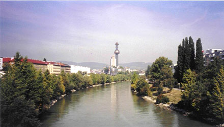 Blick von der Friedensbrücke in Richtung Spittelau, mit dem von Hundertwasser gestalteten Heizkraftwerk | |