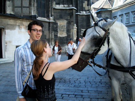 Der ganze Stephansplatz ist also mit Grabgewölben unterkellert.. puh, da waren wir froh, als wir wieder hinaus ans Licht und ins Leben traten! Chrissy streichelt ein freundliches Fiakerpferd.. | |