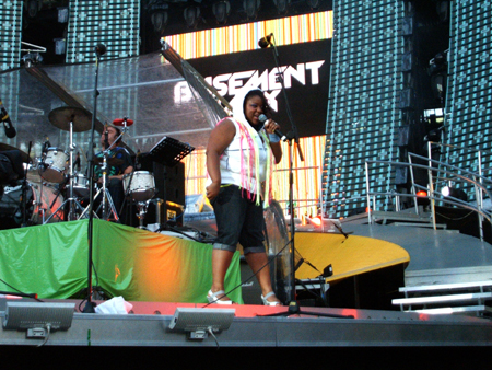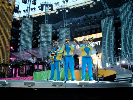 Irgendwann waren wir dann tatsächlich drin, saßen/standen in der 2. Reihe.. und so irrsinnig die Warterei ist, es hat auf so einem Konzert nur Sinn, vorne zu stehen! Die Vorband "Basement Jaxx" mag ich ja von ihren Studioproduktionen her nicht so, aber sie machten ´ne gute Show. Mit dicken, aber sehr beweglichen schwarzen Frauen und einer lustigen Bläsergruppe. | |