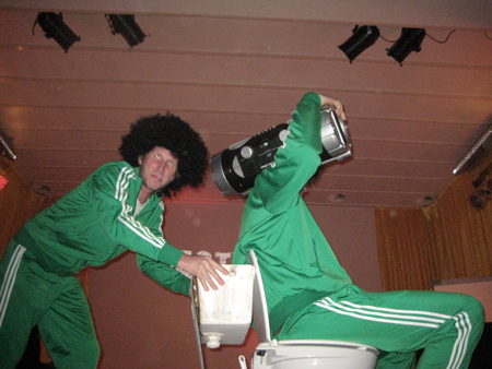 ..und aus der Perspektive wirkt Tommy Wosch noch größer. Und irgendwo ganz oben sitzt der Kopf drauf. Wie immer mußte Michi ihn auf dem fahrbaren Klo nach vorn karren, und dann besahen sich die Unterhaltungskünstler den rammelvollen Saal.. nachdem sie es geschafft hatten, die Stadt zu erreichen, obwohl es die Autobahnausfahrt "Frankfurt/Oder-Süd", die der Routenplaner auswarf, gar nicht gibt, und man nach Frankfurt/Oder-Mitte schon in Polen ist.. wir fielen übrigens nicht darauf rein! |