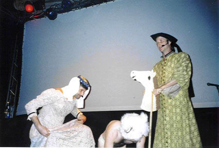 Bericht vom Medienhuren-Auftritt in Potsdam am 22.09.2003 Ziemlich unverhofft, weil nirgends angekündigt - nur einmal während des Comeback-Blue-Moons angesagt (und gewisse gutinformierte Internetseiten wussten´s auch .. ;-)), umsonst und drinnen in der sogenannten Fritzkneipe in Potsdam-Babelsberg, gab es noch eine Show aus der Erfolgsserie "Eine Medienhure packt aus"! Dennoch wurde der Saal - ein ehemals prachtvolles, nunmehr etwas angegammeltes größeres Kronleuchterzimmer - voll! Und es war großartig wie immer; wie Wosch aktuelle Bezüge einbaut, beeindruckt mich stets wieder. Dieses Mal bekam Leni Riefenstahl noch einige Freundlichkeiten ins Grab nachgeworfen, verdientermaßen .. ja, ich weiß, es heißt "De Mortuis Nil Nisi Bene", was laut Kurt Schwitters mit "man soll den Toten nicht auf die Beene niesen" zu übersetzen ist. Aber der Herr Wosch niest Ihnen mit gutem Recht auf die Beene, tote Frau, zur Erheiterung der Massen, was doch auch immer Ihr Ziel war, nicht wahr? Ansonsten präsentierten Tommy und Michi ihr Programm nahezu unverändert .. gut, aus dem "Neger" wurde ein "Farbiger" oder doch ein "Neger" - und der Kranich im Tiere-Raten-Quiz wurde durch einen Reiher ersetzt, den Tommy Wosch als begnadeter Vogelimitator täuschend echt interpretierte. Weitere Höhepunkte waren Lore als definitiv entzückendste Nippel-Limit-Queen der ganzen Tournee, die volle Punktzahl des Polit-Quiz-Kandidaten, wie hieß er noch gleich? und eine der besten Wosch-Sterbeszenen, bei der Michi fast noch einen Tritt mitbekommen hätte.. Nach der zweiten Zugabe - als Gratulation zu seinem gelungenen Comeback im Radio, als Dankeschön für diesen Auftritt und als Anerkennung für den Radiogott überhaupt - überraschten einige Fans den Medientycoon noch mit einer weiteren Preisverleihung: Tommy Wosch wurde mit dem GOLDENEN RADIO ausgezeichnet! Damit ist die "Medienhure" wohl endgültig abgeschlossen .. aber es besteht übrigens Hoffnung auf ein neues Bühnenprogramm in gar nicht allzulanger Zeit! Ach so.. und die Bildchen rechts sind mit Beschreibungen versehen, einfach mal drüberwandern (mit dem Mauszeiger natürlich!) | |